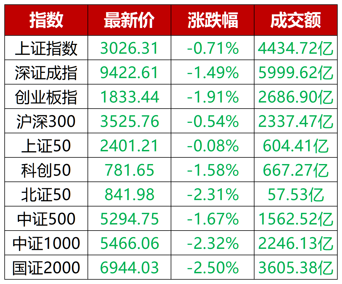 今日三大指数均下跌,各主要成分股指数也都收出中阴线。盘面黄白线分化明显,中证1000、国证2000均跌超2%,中小题材呈现普跌。