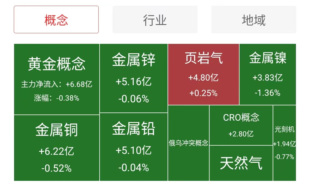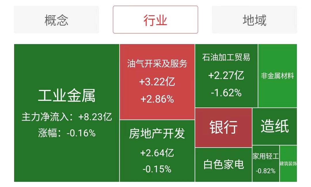 主力资金净流入最多的行业板块是工业金属、油气开采及服务以及房地产开发板块,流入最多的概念板块是黄金概念、金属铜、金属锌、金属铅和页岩气板块。