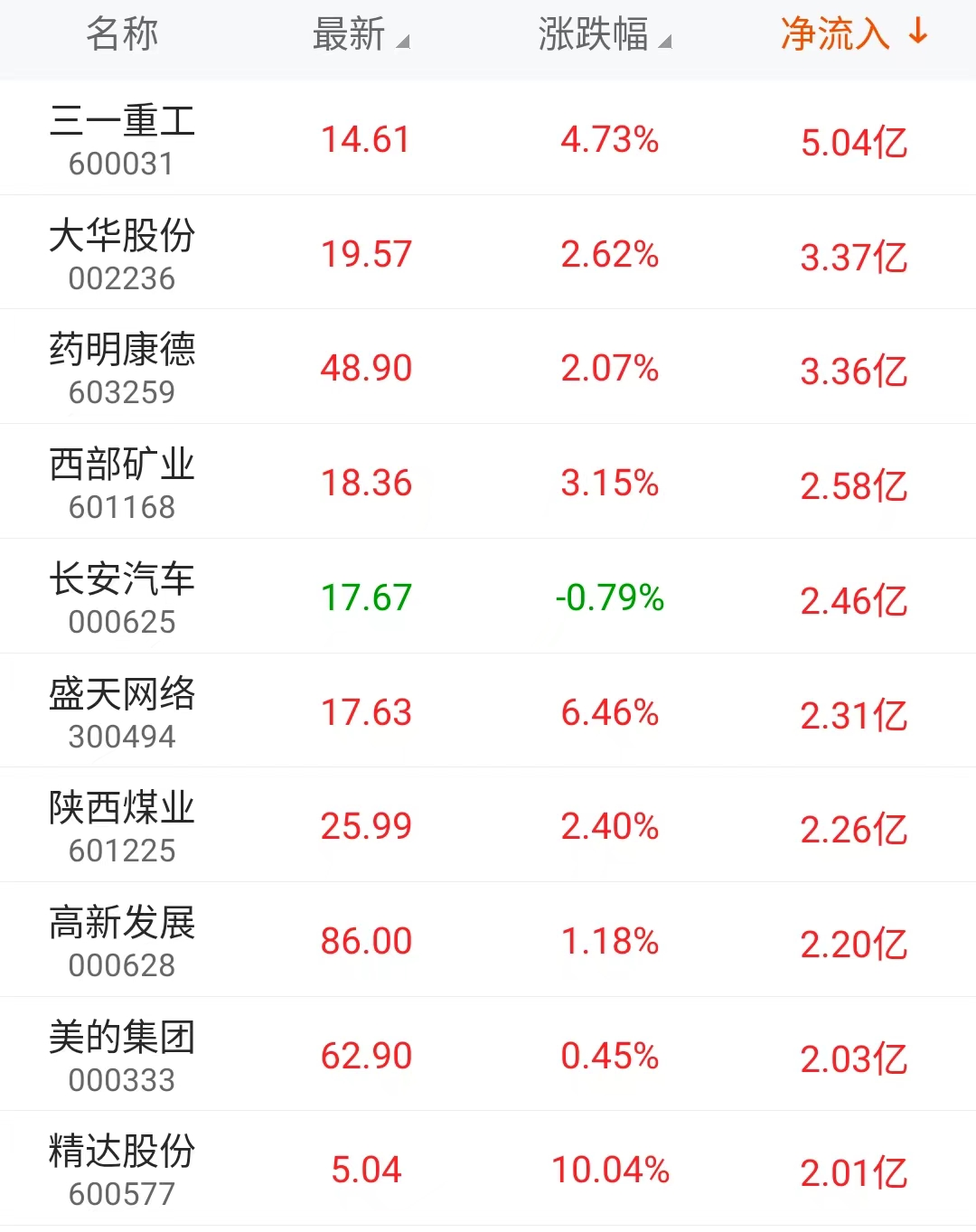 主力资金净流入最高的个股为三一重工,流入金额超5亿元,大华股份和药明康德主力净流入均超3亿元。