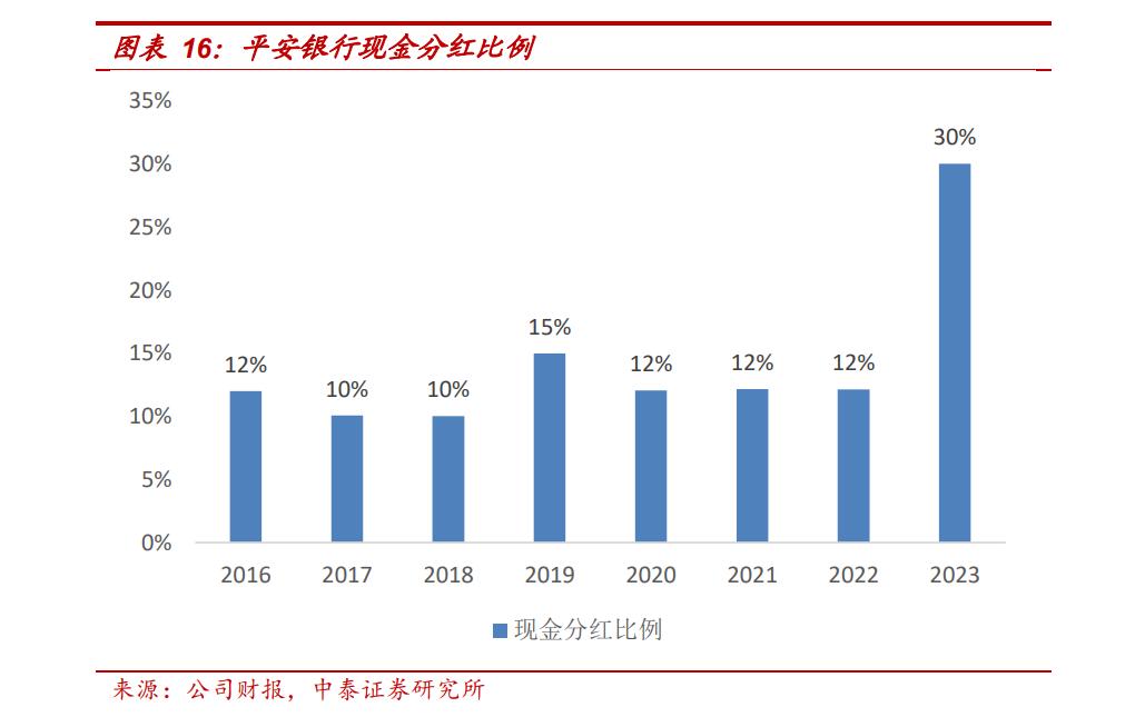 2023年度利润分配预案显示,平安银行拟每10股派发现金股利7.19元,合计派发现金股利近140亿元。综合来看,2023年平安银行的分红率达到了30%。