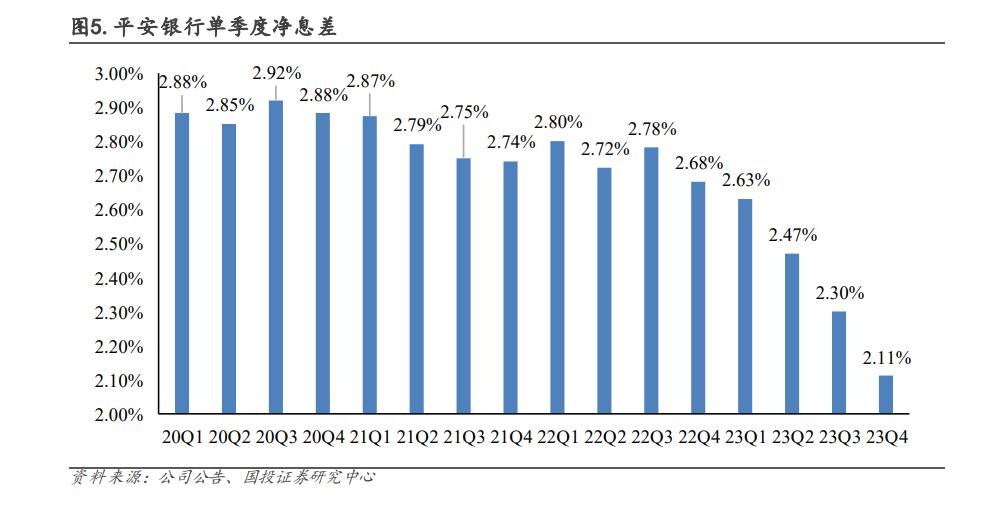 虽然竞争对手还没有发布数据,但从2023年三季度的数据和四季度的趋势来看,平安银行的息差优势依然稳固。数据显示,2024年第四季度,平安银行单季净息差为2.11%,环比下降19个基点。