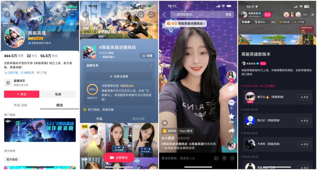 团队竞技类手游《高能英雄》与《全明星街球派对》有着同样的情况。因此产品的首要任务就是积极寻求破圈,营造产品上线爆发阶段的活跃氛围。对此,巨量引擎为《高能英雄》在不同阶段定制了差异化的投放组合,配合原生内容与品牌阵地打造,实现多类资源组合布局,保持一定量级硬广强曝光,配合多PGC达人齐发声,叠加品牌经营资源矩阵,成功激活抖音上的内容影响力,实现玩家破圈和增粉沉淀。