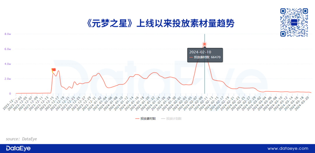 DataEye-ADX投放数据显示,腾讯旗下派对游戏《元梦之星》在上线爆发阶段就展示出强势的素材投放量,而在春节假期期间单日投放素材峰值更是突破6万组。同时DataEye估算数据指出,《元梦之星》三个月全渠道新增注册用户1.29亿。