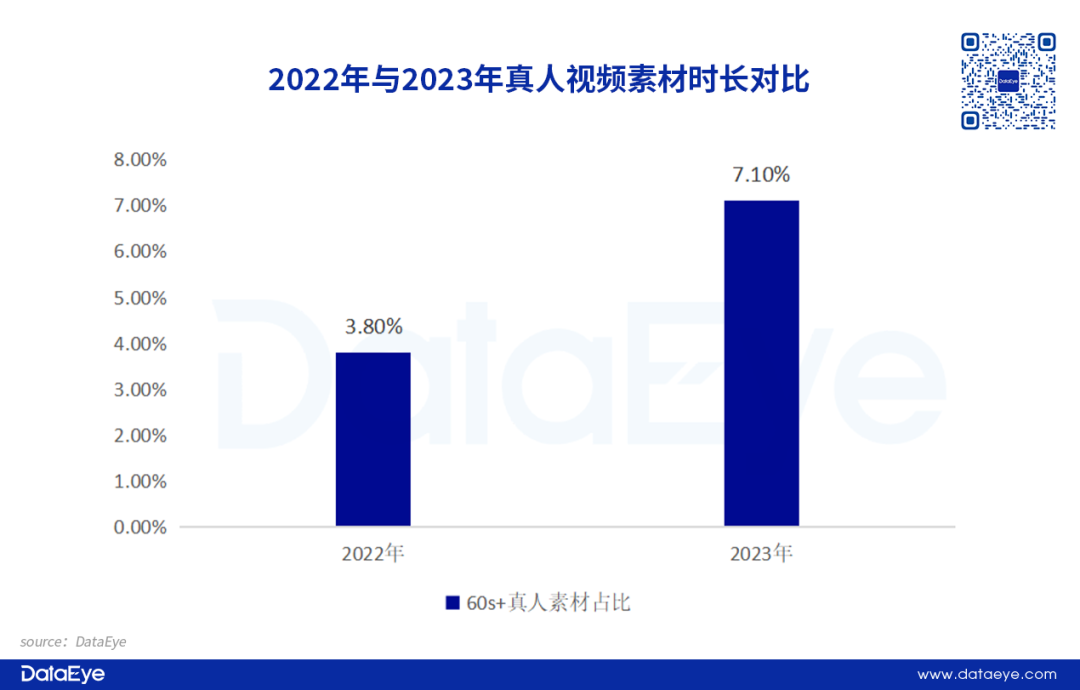 值得注意的是,以往效果广告追求黄金三秒原则,可是DataEye研究院观察到,2023年60s以上真人素材占比真人素材大盘,从原来的3.8%升至7.1%。侧面说明,越来越多项目组愿意在创意素材中增加故事内容,以丰满创意素材本身,使其更具有可读性。![]()