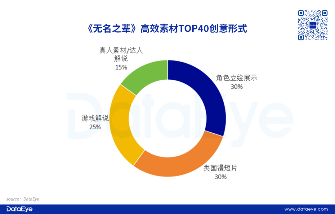 素材投放量强势,可是在创意素材内容上,项目组更注重画面表达。根据DataEye研究院整理了《无名之辈》近期高效素材TOP40创意形式,数据显示,角色立绘展示和类国漫动画短片占比超过50%。