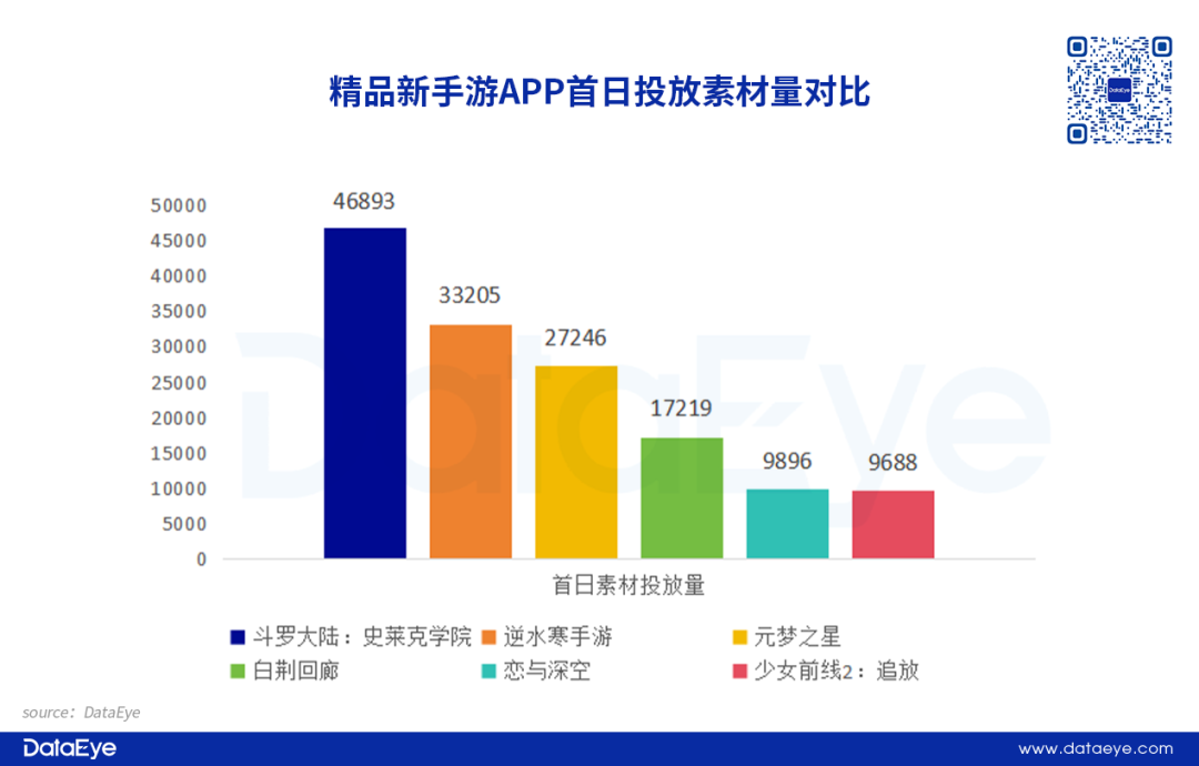 同时DataEye研究院观察到,手游APP上线首日大规模投放进入市场逐渐成为”常态化“,其中《斗罗大陆:史莱克学院》首日投放量超过4.5万,而《逆水寒》首日投放量也超过3万(视频+图片,去重)。过往不太买量的女性向和二次元,头部产品首日投放量均接近万组。