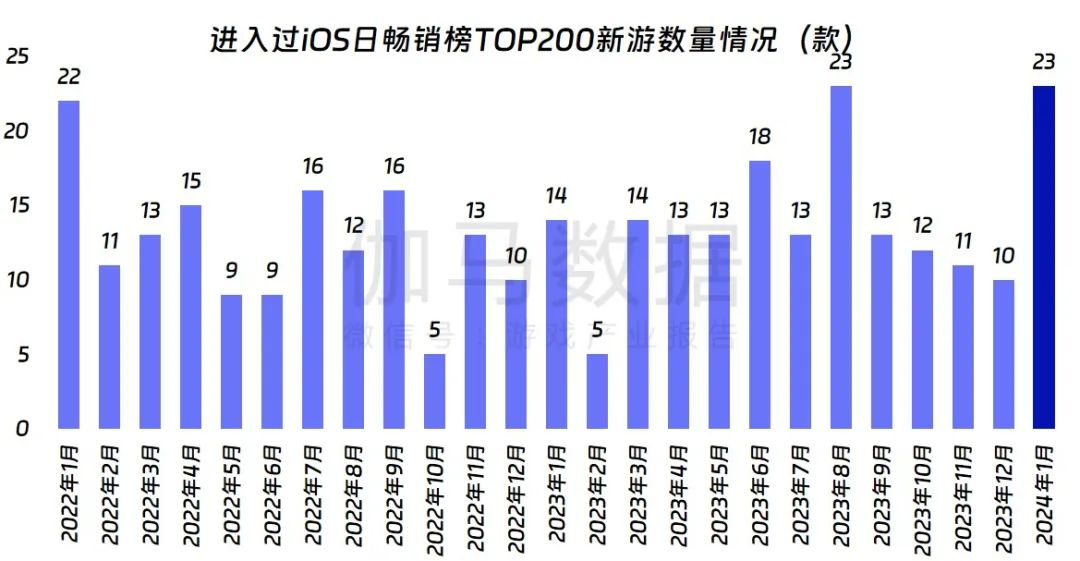 2023年以来,由于新品游戏陆续出现,为游戏营销带来了一些新变量、新现象。伽马数据显示:截至1月,进入过iOS日畅销榜TOP200的新游,达到23款,是2022年以来最高水平。