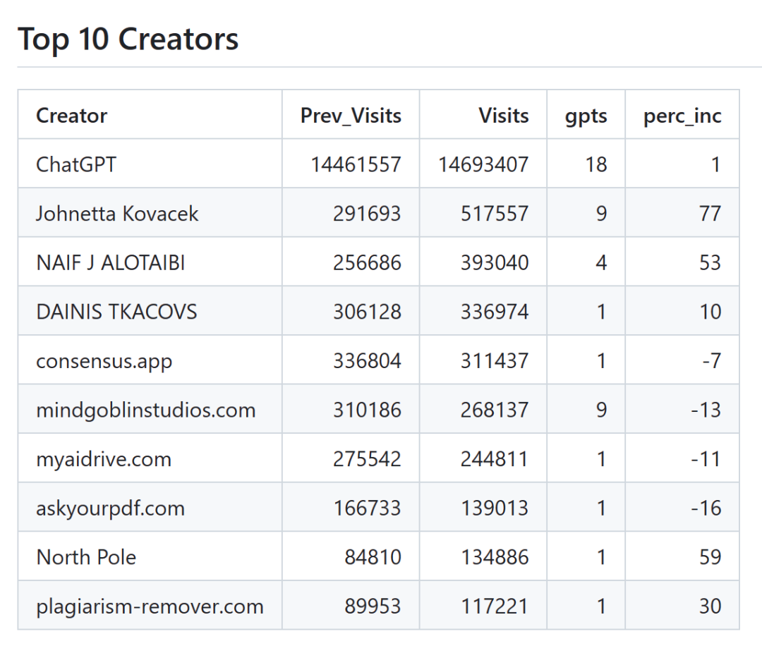 GPT store前十名创作者产品的访问量