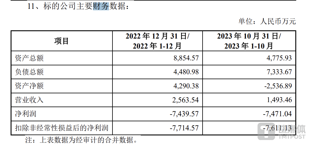 不过,标的公司的财务状况并不好,不仅出现亏损,还处于资不抵债的状态。2022年至2023年1-10月,公司的营收为2563.54万元、1493.46万元;净利润分别为-7439.57万元、-7471.04万元,公司最近一年及一期净利润持续亏损。净资产方面,截至2023年10月31日,公司的净资产为-2536.89万元。