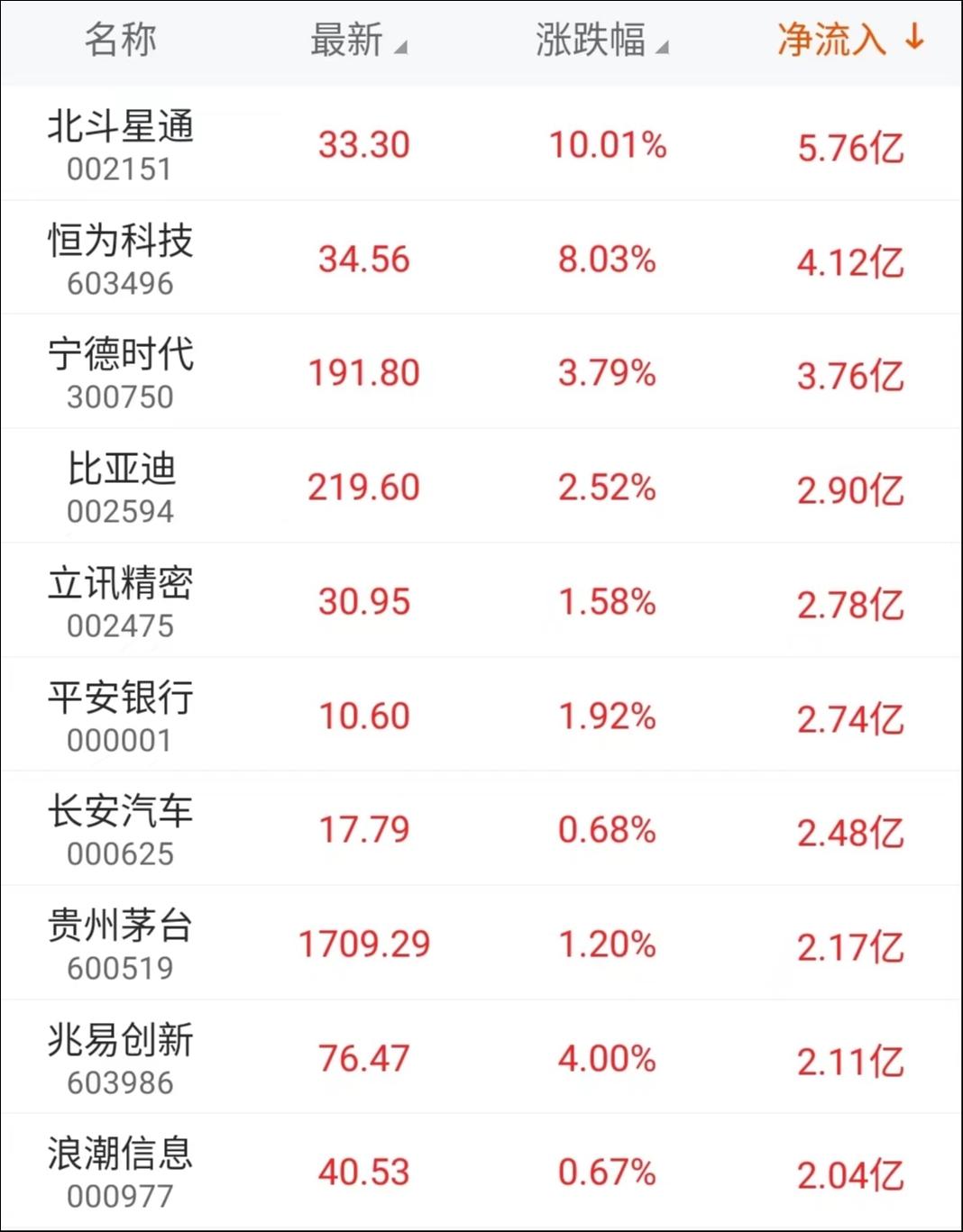 主力资金净流入最高的个股为北斗星通,流入金额超5亿元,恒为科技流入金额超4亿元,宁德时代流入金额超3亿元。