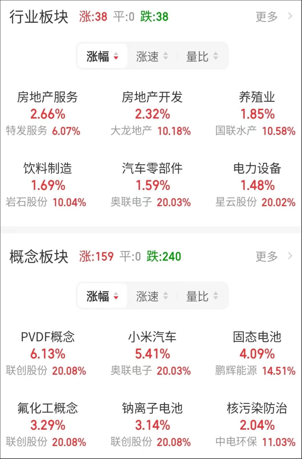 今日领涨的行业板块是房地产服务、房地产开发、养殖业以及饮料制造板块,领涨的概念板块是PVDF概念、小米汽车、固态电池、氟化工概念。