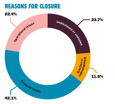报告提到,经调研,42.1%场馆因为经济原因导致关闭,22.4%是因为运营困难。其中,以下原因被认定为导致永久关闭的原因,如因能源价格、商业税率、供应成本或租金导致的债务和破产;客流量减少和运营成本的提升导致的财务困境;疫情导致的相关限制措施,以及对经济和物流的影响;噪音减少令的颁布、其他与场所活动相关的纠纷;场所的营业执照被吊销或无法实现的执照更新条款;场地建筑为重新开发改造而被出售等。