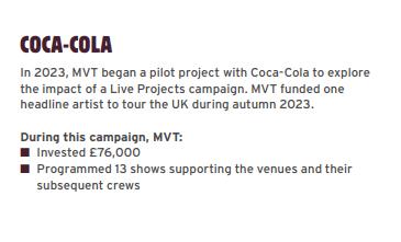 在这方面,或许也可从MVT发布的年度报告中获得启发。如在2023年,MVT联合可口可乐发起试点项目,投资76,000英镑资助一名艺术家在英国发起十三场巡演。而在国内Livehouse行业峰会上,这类商业音乐活动的讨论也颇受关注,如街声StreetVoice演出事业中心副总经理Emilie提到Livehouse经营者可以探索带有个人特色和品味的歌单,寻找不同的派对主题。