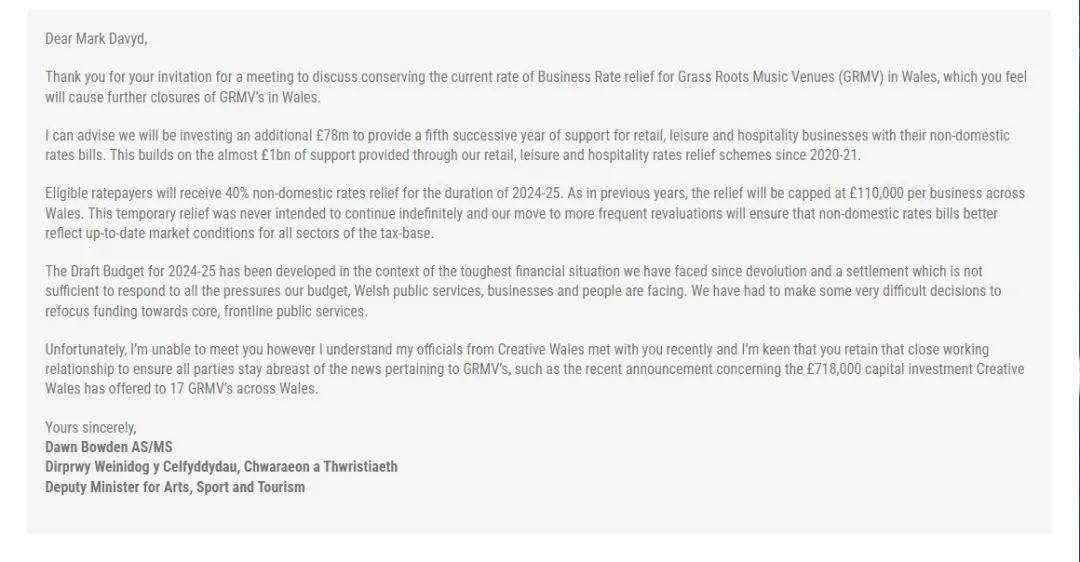 而威尔士政府也给出了相应的答复,由于其面临的财政压力,只能在现有的零售、休闲和酒店业的减免政策基础上,再额外投资7800万英镑,以支持文化产业的发展,但对于临时性的75%的税收减免政策也表示无法再进行下去,该额度将恢复为40%。