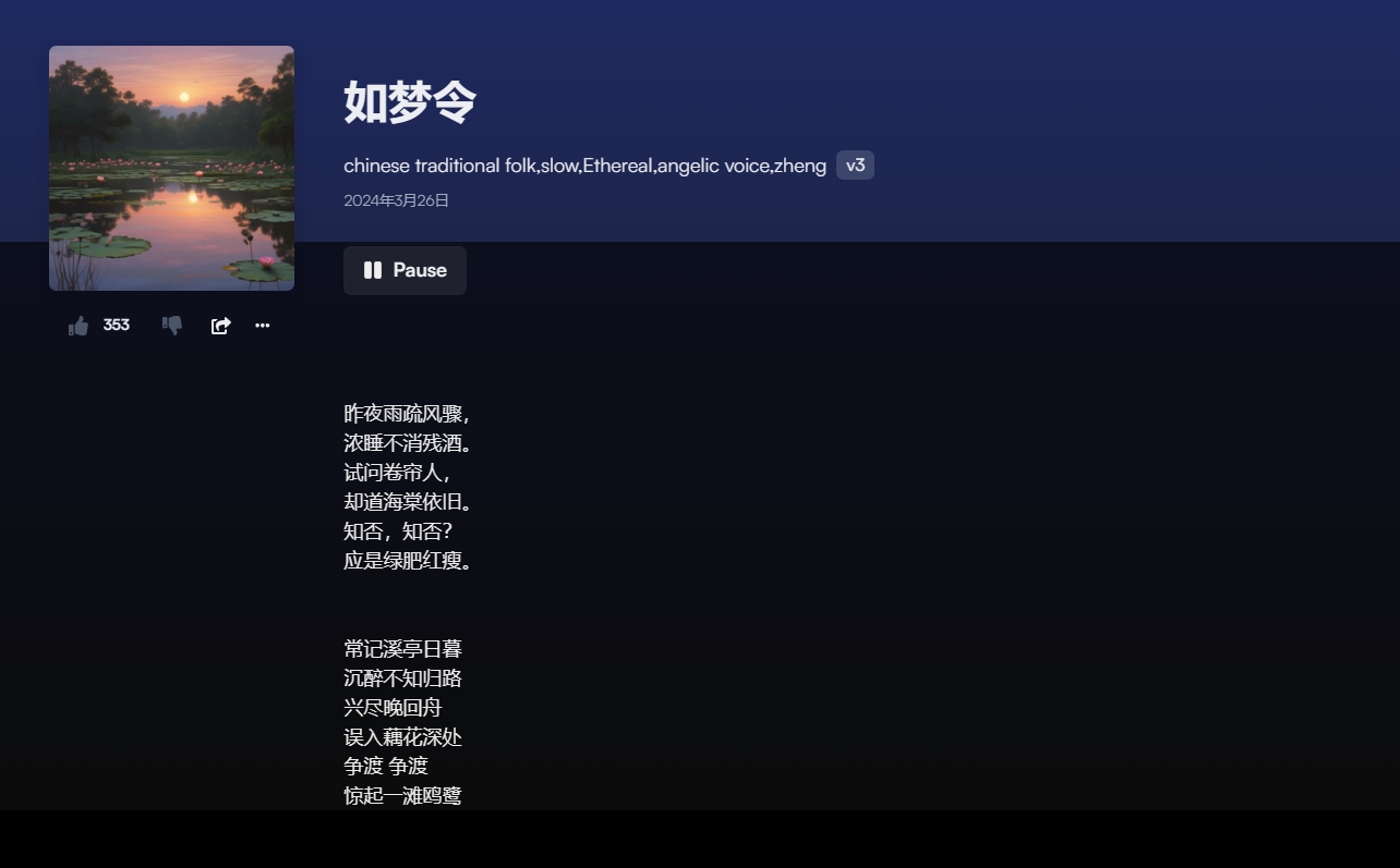 点击右上角的制作按钮,就能进入到主界面了。在探索页面,我们能看到由网友创作的优秀作品,有电子音乐、重金属摇滚、传统民谣、蓝调等不同流派,Suno根据播放量和点赞量对歌曲进行排名。可以看出,Suno支持包括中文、英文在内的多种语言,对中文生成的AI歌曲非常友好。像「如梦令」、「水调歌头」等歌曲听起来十分舒服,相当符合国人的歌曲喜好。