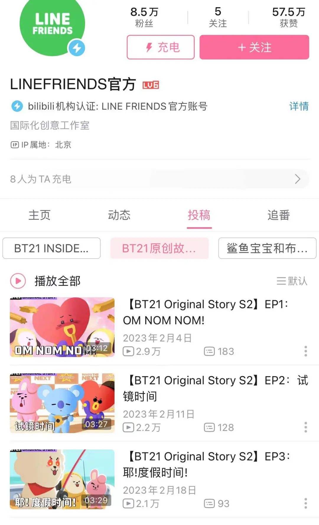 在b站上面,LINE FRIENDS还经营了一个官方“小电视台”,这里有家族成员联袂出演的泡面番,也会制作一些微综艺。和防弹少年团合作的BT21,已经更新出UNIVERSE、VLOG-RJ、INSIDE MANG、HOPE IN LOVE等多个系列动画。