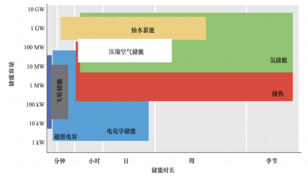 主要储能技术的储能容量和储能时长。图片来源:《新型电力系统发展蓝皮书》(国家能源局,2023.06)