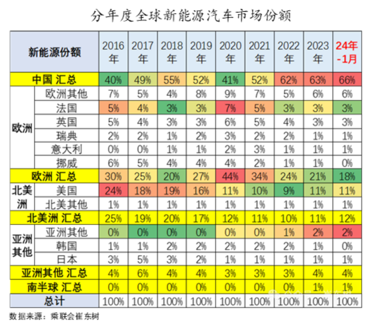 如果从渗透率的角度看,2023年底,中国乘用车市场新能源的渗透率高达39.8%,美国只有10%,欧洲十国只有27.6%,看似中国的增速会放慢,欧美潜力很大。但实际上,2024年全球新能源汽车市场,还得靠中国市场撑着,欧美增速放缓是大概率事件。