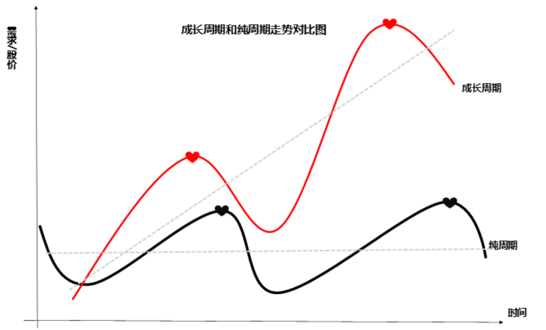 如上图,黑色的纯周期只有波动,围绕着一个价格上下波动,而红色的成长周期则是向上的,股价总体随着时间水涨船高,最明显的标志是每一个高点都比上一个要高。
