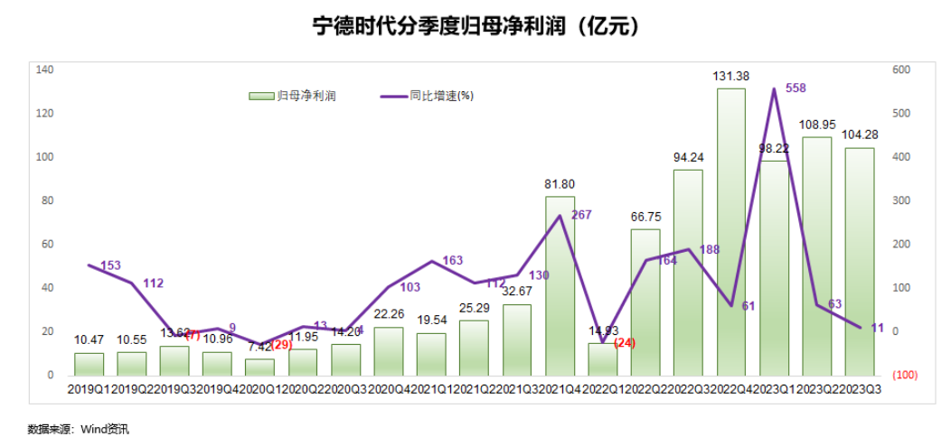 按照业绩预告,宁德时代2023年的净利润是425-455亿元,平均每个季度100多亿。