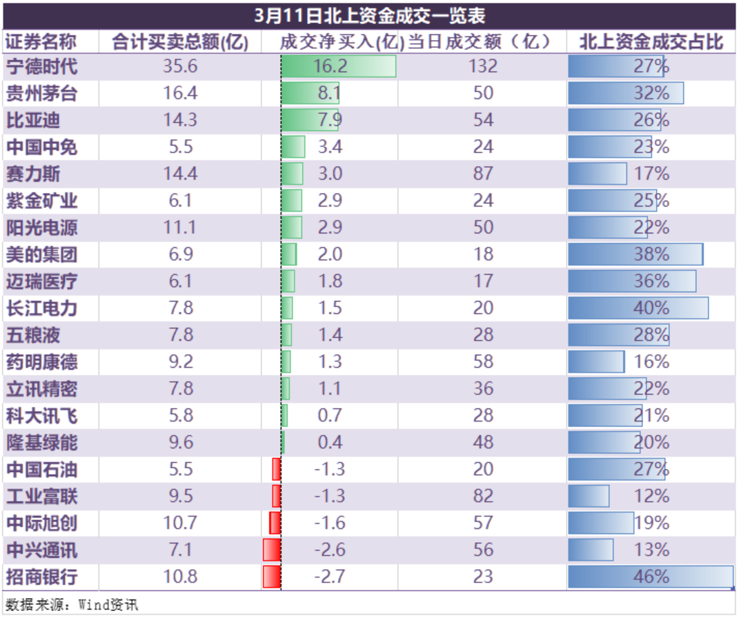 3月11日这天,宁德时代拉涨14.46%,导火索是大摩的一篇报告,还有小作文说公司1季度的净利润可能达到130亿。北上资金净买入了16.2亿,占到当天成交额的27%。