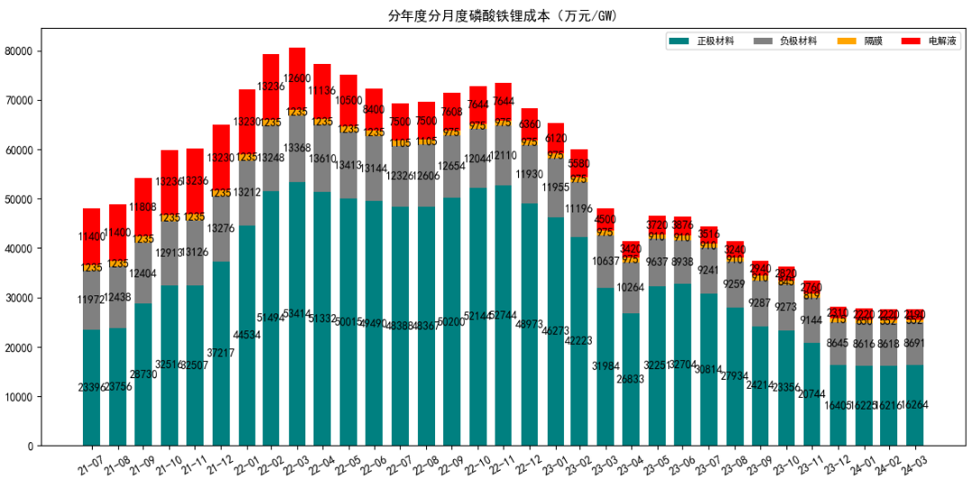 以每GW磷酸铁锂电芯计算,高点时的正极材料成本约5.3亿,最近已经降到了1.6亿,降幅70%;负极材料略好一些,从1.3亿降到了0.86亿,下降了34%;隔膜材料从1235万,降到了552万,降幅55%。电解液降幅最大,从1.32亿回落到了2200万左右,下降了83%。