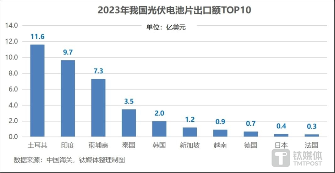对于我国光伏产品出口贸易来说,印度、土耳其都堪称重要目的地。2023年,以出口额计,我国对印度共出口了22亿美元光伏组件,占组件出口总额约5.5%,在各出口国中排名第四;出口光伏电池片约9.7亿美元,在各国中排名第二,仅次于土耳其;而土耳其方面,我国全年对其出口了11.6亿美元的光伏电池片,占到电池片出口总额的28.9%,是我国电池片出口第一大国;组件方面相对较少,共计7271.6万美元,在各国中排名第55。
