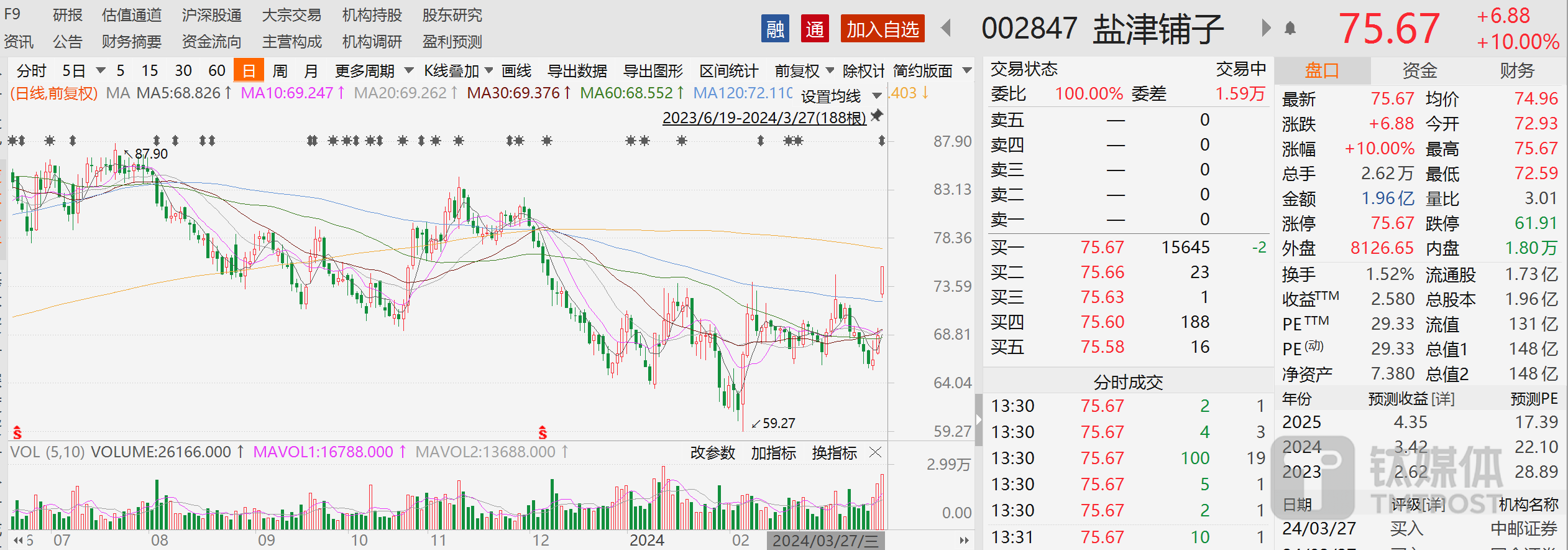或受上述利好影响,公司股票开盘后直接拉涨停板。毕竟,在2023年整体消费降级的情况下,公司能交出如此靓丽的“成绩单”,一定程度上超出市场预期。截至3月27日收盘,公司股价收报75.67元,涨幅10%,总市值148亿元。