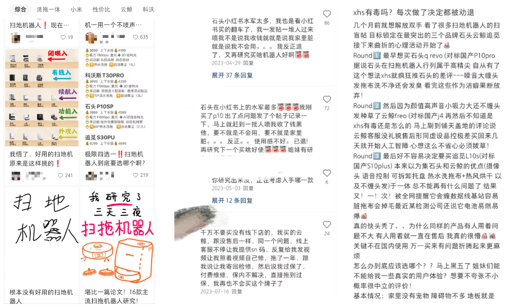 一位网友自述了自己选品的过程——刚准备买石头,小红书就疯狂推石头的差评;又被云鲸种草,大家又拿售后不礼貌说事……