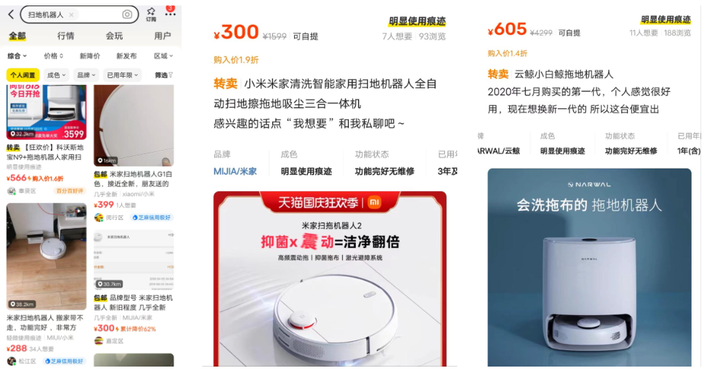 二手平台闲鱼们,便兼顾了90后的面子和里子。以扫地机器人为例,在闲鱼上多个清洁小电器品牌的降价幅度都很喜人。![]()