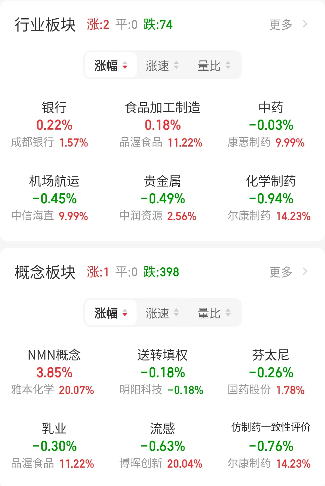 今日领涨的行业板块是银行、食品加工制造板块,领涨的概念板块是NMN概念板块。