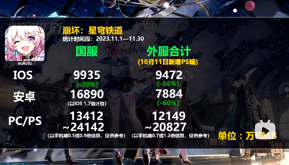 当然,二游玩家的“退坑”有滞后性。很多人是会等自己喜欢的角色up后,把手里所有代币都扔进卡池再跑路,所谓“最后爱一次”。9月份饮月UP,10月份同为“云上五骁“的镜流UP,这俩卡池整体看着还不算太惨,等到了11月,抽完喜欢角色的玩家跑路了,就直接反映在流水上——跌幅70%。
