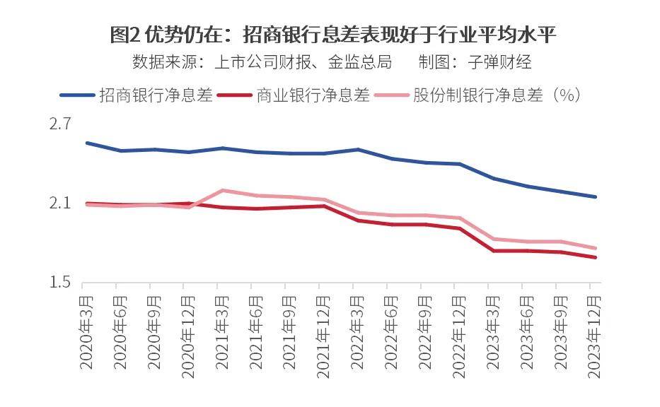 幸而,从净息差的表现来看,招商银行的表现仍好于行业平均水平。2023年报显示,招商银行净息差从年中的2.23%缩减到2.15%。虽然是继续承压,但从绝对值来看,仍高于金监总局公布的商业银行和股份制银行2023年净息差,即1.69%和1.76%。