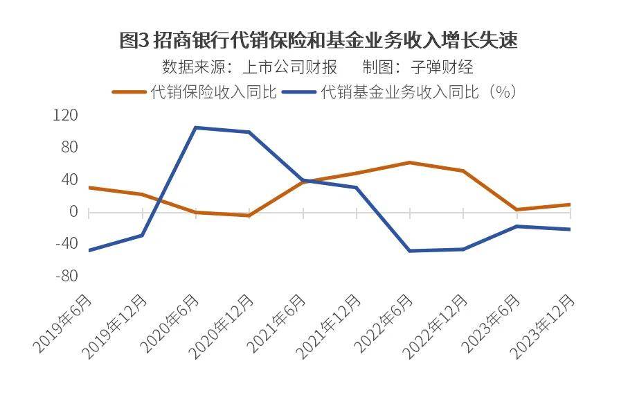 数据直观显示出,招商银行代销保险、代销基金这两类财富业务已经告别了高增长时代。2023年年报显示,招商银行代销保险、代销基金业务分别录得135.85亿元和51.79亿元的收入。保险代销收入同比增速从35%—60%的水平回落到9.33%,基金代销收入更是已经开始同比缩减。