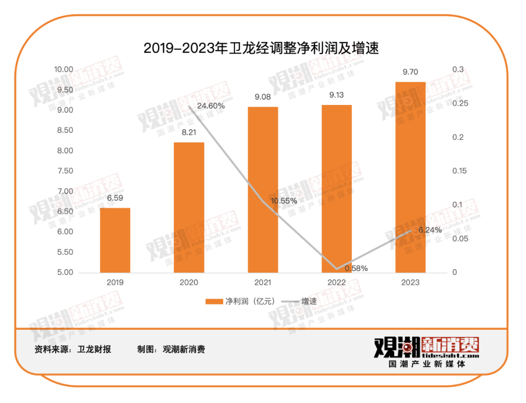 而卫龙的净利润增长也不体现在481.9%的夸张数字上,2023年,卫龙经调整净利润9.7亿元,同比增长6.3%,经调整净利润率从上年同期19.7%微增至19.9%。