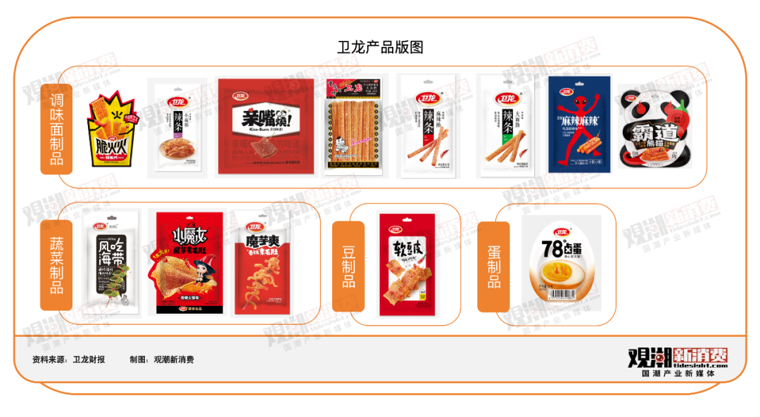 魔芋爽是卫龙从辣条企业向辣味零食企业过渡的分水岭,2014年推出魔芋爽后,卫龙又在2015年推出豆皮、2019年推出风吃海带、2021年推出卤蛋,持续拓展产品版图。
