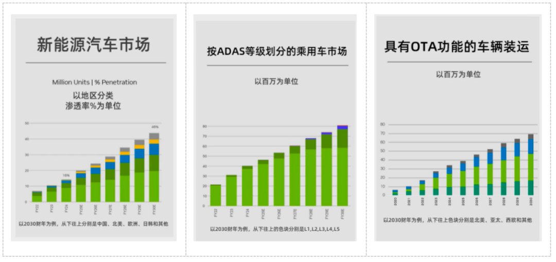 在新能源渗透率稳步提升的大前提下,根据其预测,2030财年L3级别自动驾驶市场仍将呈现显著上升趋势。