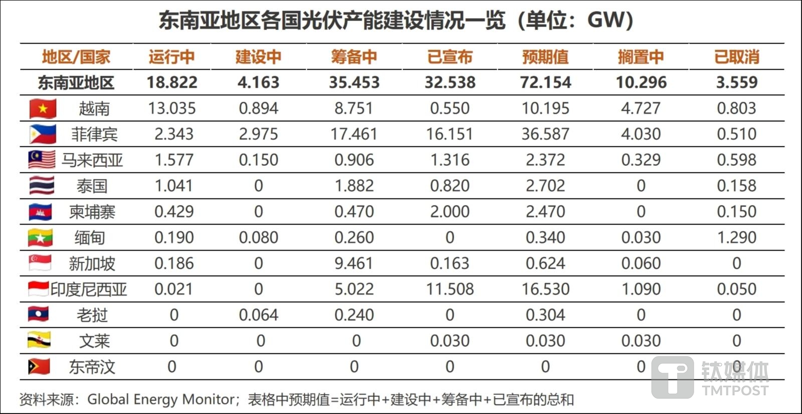 而在下游需求市场方面,根据Global Energy Monitor的统计数据,截至2023年底,除文莱、老挝和东帝汶外,其他东南亚国家都有在运行的光伏项目,光伏累计装机总规模为18.7GW(该统计口径主要为公用事业装机量),光伏也是东南亚目前发展最快、规模最大的清洁能源。而到2025年,如果想要达到东盟成员国35%可再生能源装机目标,至少还需要再新增17GW的光伏加风电的产能(按比例估算,光伏大概在11-12GW之间)。目前,东南亚各国已进入施工建设阶段的光伏项目约4.2GW,想要达成目标、实现更大规模的发展,就需要寄希望于筹备中的35GW和已宣布将建设的32GW项目,不过这些项目不确定性较大,其中有多少最后能转变为真正的装机量尚未可知。