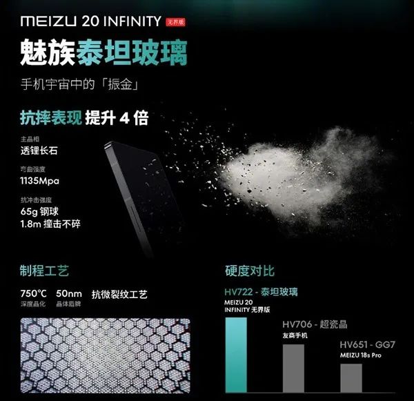 魅族20无界版在发布会中,首次为我们带来被魅族誉为“手机宇宙中的振金”的泰坦玻璃。有业内人士推测,泰坦玻璃背后的生产同样来自伯恩光学。泰坦玻璃的制造工艺包括750度的深度晶化处理,结合50nm的晶体盾牌技术,以及一项独特的抗微纹工艺,共同铸就了其卓越的品质。在硬度方面,泰坦玻璃不仅较前代 魅族18Pro采用的GG7玻璃有了显著增强,而且其硬度比业界标准的HV706超瓷晶玻璃还要高出30%,堪称市场上最坚固的玻璃之一。这种玻璃的引入极大地提升了手机的抗摔性能,能够承受65克钢球从1.8米高度落下的撞击而不破裂,使得抗摔性能提升了四倍。按照魅族官方的说法,泰坦玻璃可以让用户不用再贴手机膜,直接裸机使用也不用担心一摔就碎。