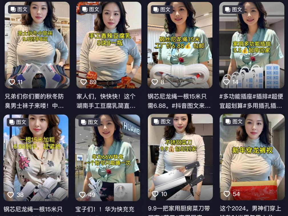 抖音上一个名叫“小姨妹”的博主,每条视频都带不同的产品,价格一般在10元以内。封面图是AI生成的美女加上几行产品介绍。如此简单的内容居然收获了110.5万的粉丝!