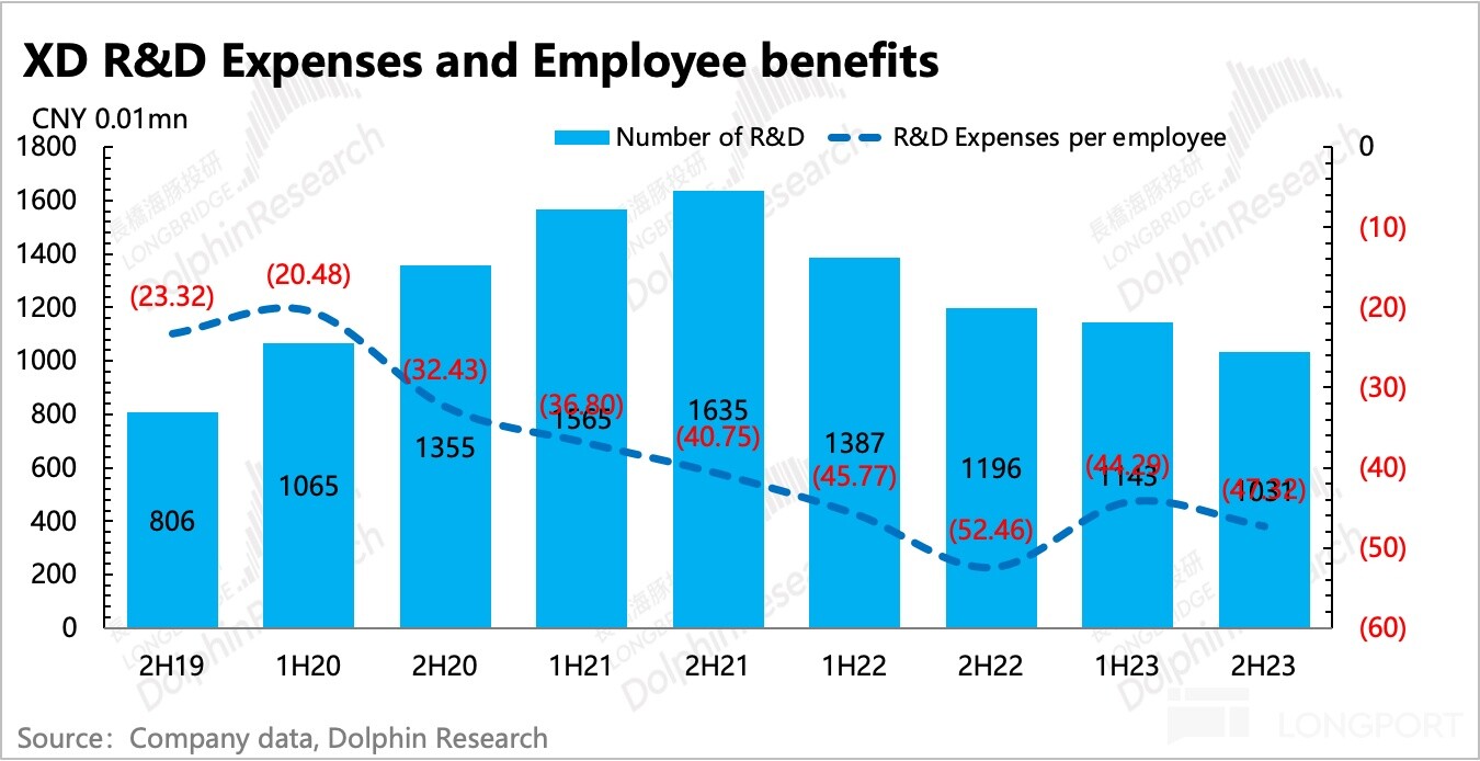 由于短期还有裁员补偿垫高支出,因此真正体现到财务指标上,还是从 2023 年开始。2023 全年雇员福利开支同比下滑 16%,并且伴随着裁员继续推进,研发人员同比减少 160 人。
