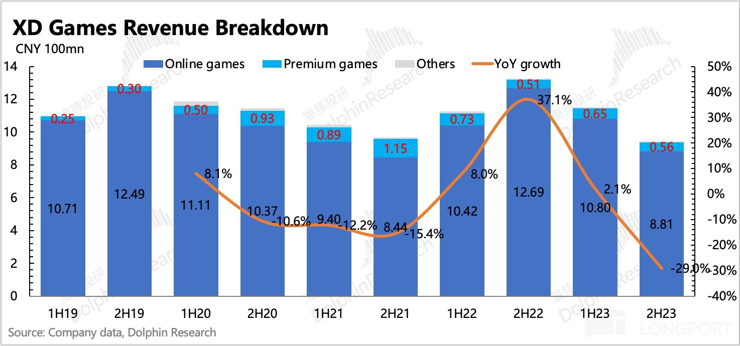 整体上看,去年下半年业绩不及预期,问题出在游戏业务。下半年游戏收入规模只有 9.4 亿,是近三年最低,同比下滑近 30%。虽然下半年有新游《T3》、《火炬之光无限》且热度不低,但挡不住流水贡献最高的《香肠派对》同比下滑。