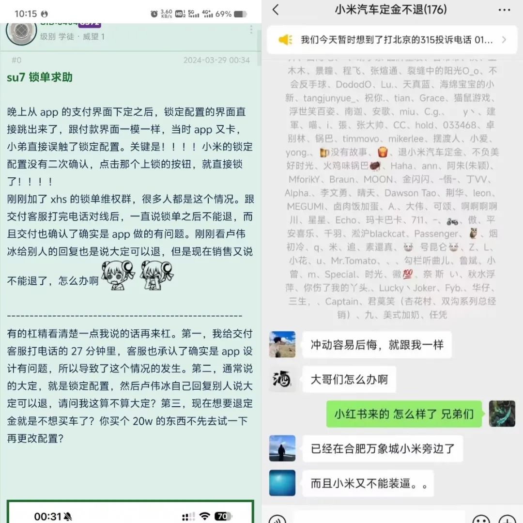 在小红书等平台,已经有网友在吐槽,冲动参加大定后,取消环节遇到了问题。网传截图显示,相关的维权微信群已经成立。这与昨晚发布会的红红火火,形成了鲜明对比。
