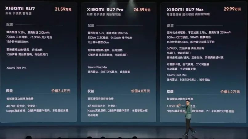 小米汽车价格公布后,我才可以回答母亲当时的问题。小米SU7一共发售了3款配置,标准版,Pro版,MAX版的价格分别是21.59万,24.59和29.99万,虽然这3个数字也不菲,但相比于su7的配置来说,确实挺香的。