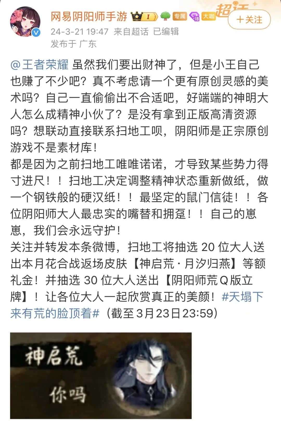 事发起因在3月21日,先是《王者荣耀》预告上线S35赛季新英雄“大司命”,而后《阴阳师》直接在官微@《王者荣耀》,指责“大司命”的人物形象抄袭了自家角色“SP神启荒”。