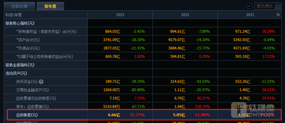 销售回款是房企补充资金的最重要来源,但大幅下滑的合同销售金额意味着新城控股的销售回款也同步减少。财务数据显示,2023年新城控股应收账款走上新高,达到6.66亿元,同比增长31.77%。
