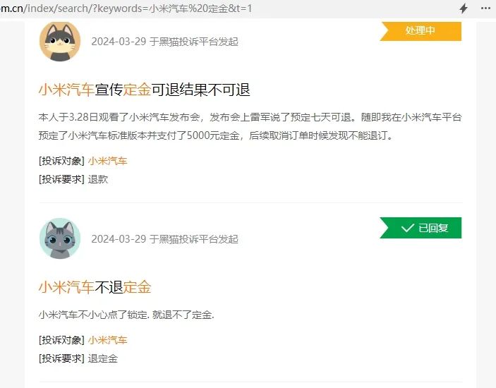雷达财经通过黑猫投诉平台了解到,目前已有多位用户因为取消订单不退定金而向小米汽车发起投诉。