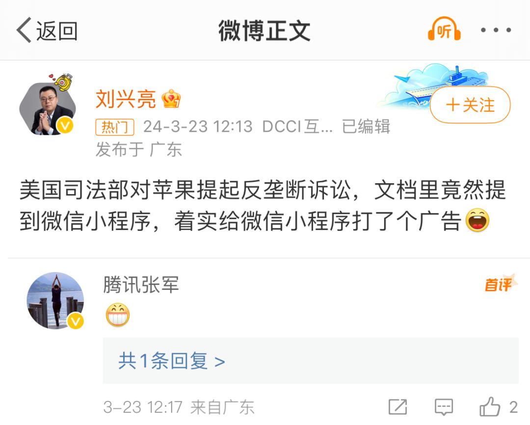 社交媒体上有人指出美国司法部的诉状中专门提到了小程序,腾讯公关总监张军在评论区中回复了一个偷笑的表情。