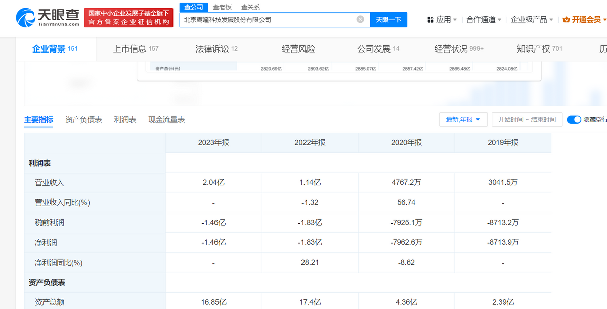 2019年到2023年,鹰瞳科技的归母净利润分别为-0.87亿元、-0.8亿元、-1.43亿元、-1.8亿元和-1.33亿元,五年累计亏损6.23亿元。