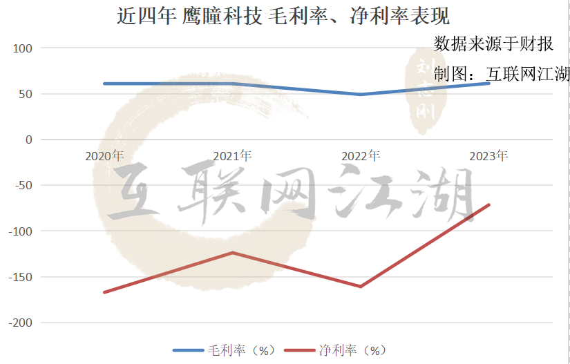 其中,2023年,鹰瞳科技的净利率表现为-71.41%,虽然较2022年的-160.78%有所好转,但怎么看怎么与同期61.35%的毛利率不相匹配。